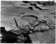 | Description: | Base of a large closed pot. On underside, at center, concentric grooves, reserved, around a black central disk. Outside this, a zone with West Slope garland. Pink clay. | |
