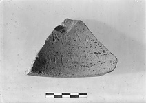 | Description: | Fragment from the rim of a krater, glazed on the top of the rim, and the inside with red to black glaze nearly all peeled off. The outside so far as preserved, seems to have no glaze decoration but was covered with a thin brown wash. Rather coarse pinkish-buff clay. Inscribed on the inside: <graphic> | |