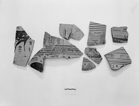 Description:   Fragments from upper part have parts of horses with reins and chariot poles. Lower fragments have panels with zigzags. One fragment has banding and upper part of animal.
