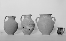 | Description: | Part of lip and small fragments from body missing. Mended from numerous fragments. Trefoil mouth. Wide flat handle. Ring foot. Red-white coarse clay. | |