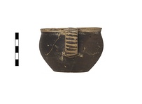 | Description: | Complete but chipped. Mended from three fragments. Flat base, walls bulging in middle, slightly flaring lip and ribbon handle. "Coon's tail" handle. Brownish-black glaze inside and out except for base and two reserved bands inside and outside lip. | |