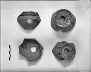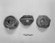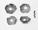 | Description: | From base of pot with disk foot. Hole cut in foot before firing. Careless glazing over part of inside and part of outside and underside. Reddish glaze; highly micaceous clay. Similar to P 26571. | |
