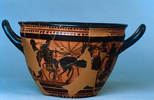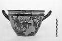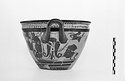| Description: | Foot missing; upper part mended from numerous fragments and restored in plaster. High bowl, concave lip, steeply canted handles, from shoulder to above rim. A: Left to right: figure moving right; looking back over shoulder; bearded man seated on small chariot, pulled by two horses, facing right; olive tree in background; bearded male touching horses' heads, facing left; bearded male moving right, looking back over shoulder. B: Left to right: draped female moving right; second figure moving right; much of center missing except for shoulder and back of head of figure moving right; upper half of bearded male moving right, looking back; upper half of bearded satyr moving right, looking left; olive tendrils in background. Figures in black with incised detail and added purple; diluted glaze for limbs, faces, spots on horses. Decoration of lower wall: elongated tongues surmounted by bands of glaze. Decoration of lip: two rows of ill-defined vine leaves. Generally good black glaze; Attic clay. | |