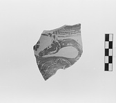 | Description: | Fragment from shoulder. Long-necked deer with head reverted. Solid rosette in field. Incision; purple on neck, ears, eye, stripes on flank, petals of rosettes(?). Unglazed inside except for neck. Part of Chimaera? | |