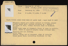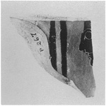 | Description: | Fragment tapers and curves outward at bottom; around curved break left, surface wrinkles up - handle(?). To the right of this, double vertical band in brownish glaze. Along right edge of fragment, front of face in profile left, flesh in applied purple; large circular eye. Incision for all drawing. Inside, along top of fragment, edge of thinnish black glaze band, indicating closeness to rim. Attic clay. | |