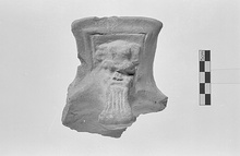 | Description: | Satyr head from top of brazier. Heavy-featured face in relief in square frame; strongly projecting beard. Fragment well preserved, except for chips at top, on left side, and nose. Coarse brick red clay with cream slip. | |