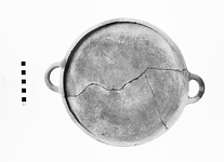 | Description: | Mended from three fragments. Complete. Shallow; slightly incurved rim; two horizontal handles attached to rim. Bean parcher. Brown clay containing very fine grit. Blackened by fire on floor and underside. Similar in style of P 26966. | |
