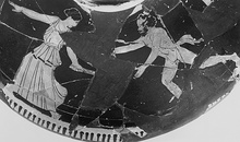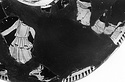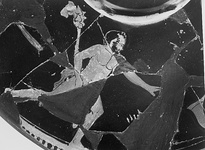 Description:   White Ground. Much broken and small fragments missing. Restored in plaster. Massive disk knob; on top a ring of satyrs and maenands in alternation; ring of vertical glazed strokes around knob and near edge. Glazed underneath; resting surface reserved.