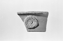 | Description: | Rim fragment of an Arretine bowl. Carinated rim with rosette in relief, on outside. | |