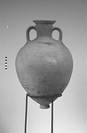 | Description: | Complete. Much chipped in lower body. Small ring foot; round body; depression at base of each handle. Wide flaring rim. Graffito on shoulder: Ε Unglazed pinkish-buff clay. | |
