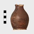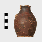 | Description: | Mouth and handle missing, but one small non-joining fragment of the mouth remains. Mended from many fragments and partially restored in plaster. Trefoil mouth, slender body; low offset foot, concave underneath. Glazed except for underside. Thin brown glaze with prominent brush strokes. Pink buff clay. | |
