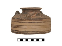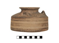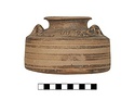 Description:   Intact. Broad flat bottom lifting at edges, straight sides contracting inward toward shoulder, three small vertical handles on shoulder, low splaying neck, flat concave-splaying rim. On base, concentric rings, one at center, three at edge. Body stripes: two, three and two. Shoulder: single wavy line above degenerate ivy leaves(?) between each handle, framed by stripes. Neck and handles painted solid, stripe on reversed rim.