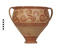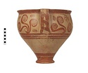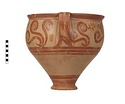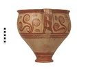 | Description: | Mended from thirty-one pieces. One piece missing below handle; rim chipped. Somewhat restored in plaster. Tall amphoroid krater with torus-disc foot, vertical strap handles from belly to rim, out-turned rim. Rim and foot glazed solid; handles edged with vertical bands, crossed with diagonal bars, framed by thin vertical stripes at ends of 'picture field'; three bands below handles, one above foot. Decoration of three curtailed Argonauts sailing left on each side with conventional formulaic seaweed and trefoil rockwork or rosette motives above and below. Argonauts go over side stripes and touch top stripe. Pale buff clay full of grit and pocks, prominent wheel ridges, fine buff slip, clear light red glaze. Probably Furumark, MP type 6 (III A:1) or 7 (III A:2 early), motive 22, no. 16 (III A:1) 17 no. 18 (II B-III A:1). | |
