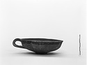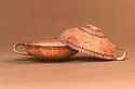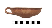 | Description: | Missing: handle, half of rim, three-fourths of bowl. Restored in plaster. Similiar to P 27452 except for raised button in center of bowl, foot broader and lower, rim more everted. Glazed on rim, bowl and under foot plain. Coarse stippling between bands on bowl, two stripes above solid glazed foot. Red-buff clay with lumps and grit, wheel marks inside not smoothed; orange-red glaze much worn. Furumark, MP type 219 (LH II b-III A:1), motive 77 no. 2, LH III A:1. Stripes above foot indicate date early in LH III A:1. | |