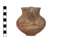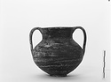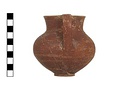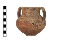 Description:   Complete but for chips from wall; mended from sixteen pieces. Same type as P 27448, but two vertical strap handles from rim to belly, faint ring foot nicely profiled, body well articulated. Paint all over outside and inside neck to 0.025m. Splash of paint under foot.