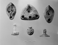 | Description: | Intact. Cross on either side surrounded by two framing rings. Two pierced holes used to separate handles from body. Wide mouth. Orange clay and glaze or wash. Cf. P 7509. | |
