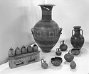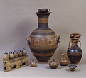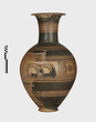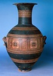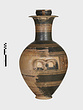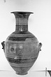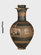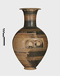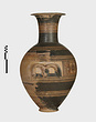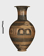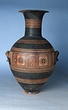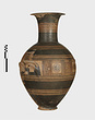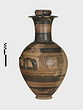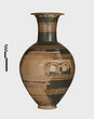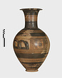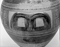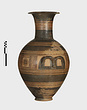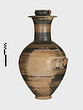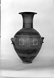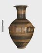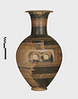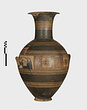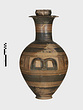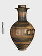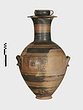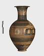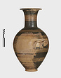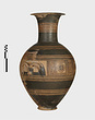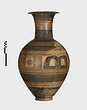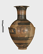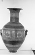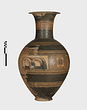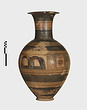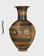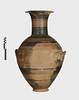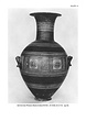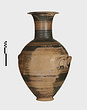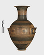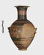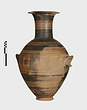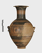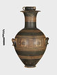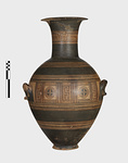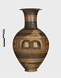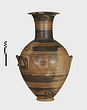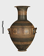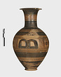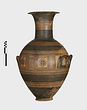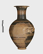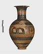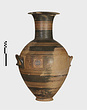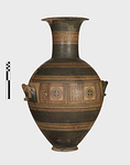 | Description: | Belly-handled amphora. Mouth broken but complete. Around neck, dotted multiple zigzag. Dogtooth on shoulder and lower body. Belly, front and back five panels (three maeanders, two circles) dogtooth above and below. Othewise glazed. Hard warm pinkish-buff clay. Black to brownish glaze peeled in places. | |