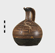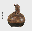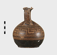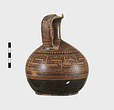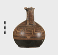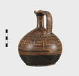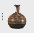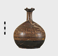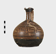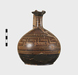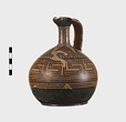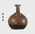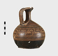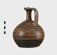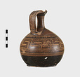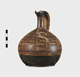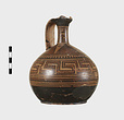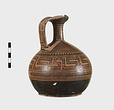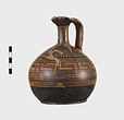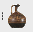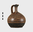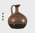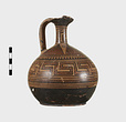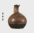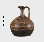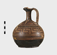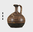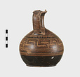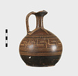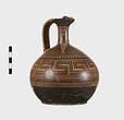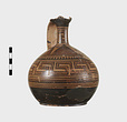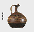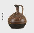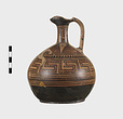 | Description: | Tip of spout corroded. Maeander on neck. Four zones on body: four crosshatched triangles, dot rosette between each; dogtooth; hatched maeander; zigzag; then glaze to base. Warm pinkish-buff clay; firm black glaze, thinning to brown on the hatching. | |