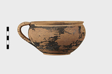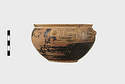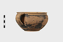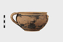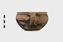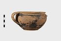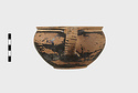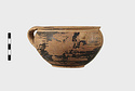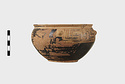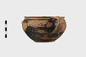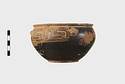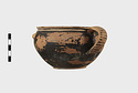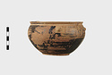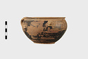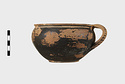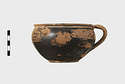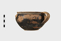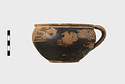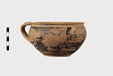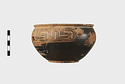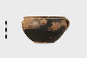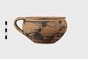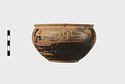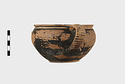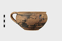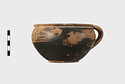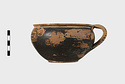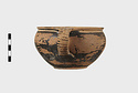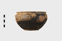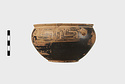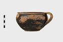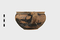 | Description: | Intact except for chips. Low ring foot. Reserved panel, shoulder front containing maeander. On either side of panel a low conical wart in a reserved square; wart ringed and angles dotted. Strokes on inner face and lip. Pinkish-buff clay; black glaze, peeled over large areas, otherwise slightly lustrous. | |