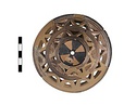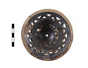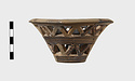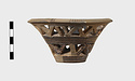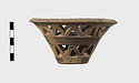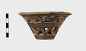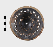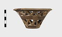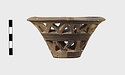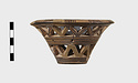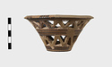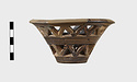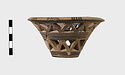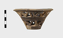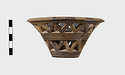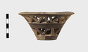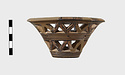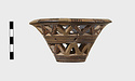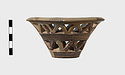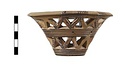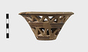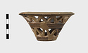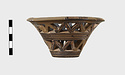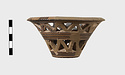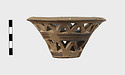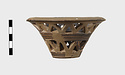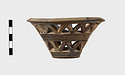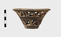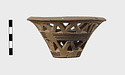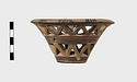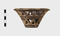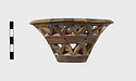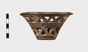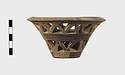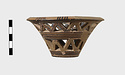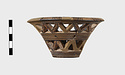 | Description: | About one-fourth missing; profile complete. Completely restored. Two banks of triangles, lower 8, upper 12. Round hole on floor. Glazed inside but not on cut faces, struts. Strokes on lip. Bands below rim and on cross brace. Struts outlined and hatched. Solid Maltese cross on bottom. Pinkish-buff clay; black to brown glaze. | |
