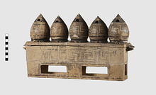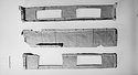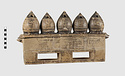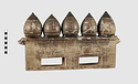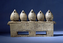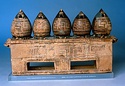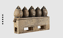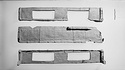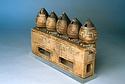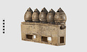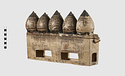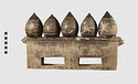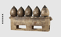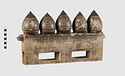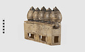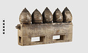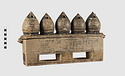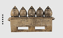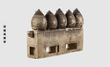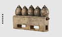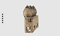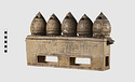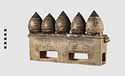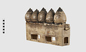 | Description: | Mended, virtually complete. Numerous joining fragments. Chest with cut-out legs; lid has five model "granaries" side by side. Lugs on body, corresponding to ears on top. Intricate decoration in panels; some multiples. Fabric, especially of box, very brittle and poorly baked. Buff with brown glaze, largely peeled. Lid better. Black glaze, firm. | |