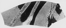 Description:   Fragment of Kertsch vase; from wall of kalyx krater(?). Female figure to right holding torches in both hands. Drapery originally painted pink, flesh of hands white and torches gilded. Male figure to left holding object in upraised right hand. Two dangling taenias attached to object, gilded.