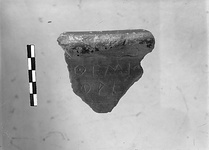 | Description: | Fragment from the rim of a partly glazed krater: black glaze on the inside and on the top of the rolled rim; transparent glaze wash on the outside. Inscribed on the outside, under the rim: <graphic> | |