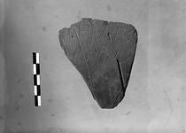 | Description: | From the wall of an unglazed pot. The letters, scratched on the outside, run at right angles to the wheel marks: <graphic> Pinkish buff clay, unglazed. | |