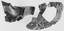 | Description: | d) base with concave underside. e), f), m) handles and remaining wall fragments. a)-d) made up of numerous joining fragments. e)-n) single fragments. A) Two youths clad in flowing chlamys and petasoi riding horses to left. b) Lower bodies and feet of two men walking to left, one with staff. Grooved line of maeander below walking men. Outer side of handles bordered by bands of concentric ovals. Reserved area beneath handles. Thick base, unglazed on sides and bottom. Light red clay; glaze generally misfired to bright red. Cf. column krater of Marlay painter, Richter (1936), Red Figured Athenian Vases, p. 172. | |