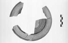 Description:   Six fragments join to form about half the rim; a seventh fragment, from the rim, does not join. Flat bottom, reserved, with a band of glaze around its outer edge this band separated from the glazed undersurface of the rim by a reserved band. The top of the rim reserved, save at the edge; in it, at the top, two holes for suspension.