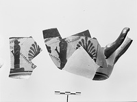 | Description: | Two non-joining pieces, each mended from several fragments; the larger preserves most of one handle and a bit of the rim. None of the base remains. Large palmettes next to the handles; to the left, on either side of the cup, a herm on a base, facing left toward an indeterminate object in the field. Vine tendrils in the field. No accessory colors; a minimum of incision. Good glaz e with metallic splotches. | |