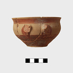 | Description: | One handle and fragments of wall missing. Mended from many fragments. Out-turned rim, very slightly offset flat foot, rolled handles. Red glazed except for rim, shoulder, base and band on interior. Thin glaze, red to brown. Cf. Hesperia 68 (1999), p. 262, n. 10. | |