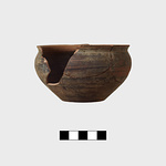 Description:   Nearly whole except for one fragment from rim and wall. Mended from many fragments. Out-turned rim. Horizontal banding on handle. Reserved line on inside of rim. Reserved spot in center.
