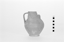 | Description: | Intact except for part of rim and neck. Joining fragment at rim and neck. Low ring foot; curving, slender body; tapering neck. Offset rounded rim; strap handle attached below rim . Orange-red clay, somewhat gritty. | |