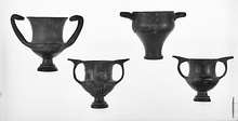 | Description: | Missing is part of wall and rim, one handle and ca. one-third of the other handle. Completely restored in plaster. Similar in shape to P 27969, though upper wall wider and lip out-turned. Pinkish-buff clay. Black to brownish-red glaze, peeled especially on upper half. ADDENDA P 27969: Low foot ring, bulging shoulder, plain, straight lip. | |
