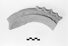 Description:   Section of upper wall and rim preserved. Overhanging rim convex in profile; three rough wheel run grooves closely spaced around inner edge. Four plastic thumb prints on handle grip. Two holes 0.003-0.004m. in diam., 0.03m. apart drilled vertically through rim near inner edge.
