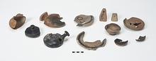 | Description: | a) Casserole complete in four joining fragments, except for fragment of floor and rim section with handle. b) Lid, about three-fourths complete in four joining fragments, knob missing. Shallow, round-bottomed casserole; traces of single handle; flange inside to receive lid. Plain convex lid with rough knob handle base. Coarse gritty dark buff clay. Cf. Hesperia 20 (1951), p. 115, pyre 1, no. 8. | |