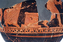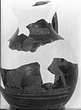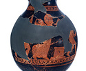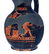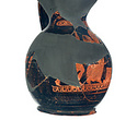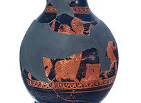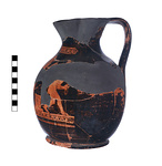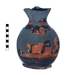Description:   Mended from many fragments which make up into two groups: the base and the lower part of the picture, and the neck and handle and the upper part. There is no direct join between the two groups and the middle of the vase, together with most of the lip, have been restored in plaster.
