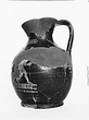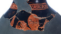No contours; the inner drawing in black relief lines; no added color. Hasty and careless work, its effect increased by the fact that the surface of the pot was not smoothed before glazing so that wheel-run ridges run horizontally through the picture.