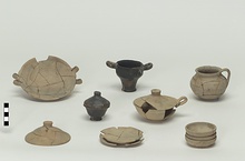 | Description: | a) Bowl. Intact. Solid, slightly flared base; rim flanged to take lid. b) Lid. Complete except for chip from edge. Convex lid, sharply turned down at rim; cylindrical knob handle. Buff clay. Thin dull black glaze. Cf. Agora XII, nos. 1276-1284, last quarter of 4th c. B.C. | |