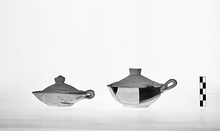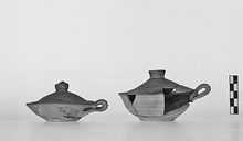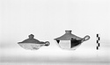 | Description: | a) Lopadion. Mended from many pieces; chips missing. Lopadion with flat bottom, convex wall, small loop handle. Unglazed. b) Lid. Mended from six pieces; chips missing. Shallow lid with cylindrical knob handle. Unglazed. Orange-buff clay. Cf. Agora XII, nos. 1562-1564, end of 4th, first quarter of 3rd c. B.C. | |