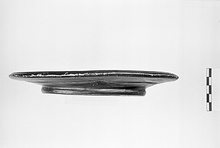 | Description: | Mended from three pieces; one large chip missing from rim. Ring foot; groove on outside wall; very flat plate; thickened and rolled rim. Orange clay. Black, somewhat metallic glaze. | |