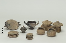 | Description: | a) Mended from twelve pieces. Complete. Lopadion with rounded bottom, small loop handle. b) Mended from seven pieces. Complete except for two chips. Domed lid with flat knob handle. Buff clay. | |