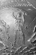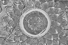 | Description: | Large chips missing; about three-quarters preserved; mended and restored in plaster. Medallion: rosette, from which spring two rows of small pointed ribbed leaves and a third row of small lotus leaves. Middle zone: various unrelated groups; rape scene (identification uncertain, cf. Courby (1922), Vases Grecs a Reliefs, p. 344, no. 26); woman with child in one hand, pulling drapery over her head with the other; Satyr; old man, partially nude, standing by a tree; woman lifting a child over her head; each group appears two times. Rim pattern: simplified guilloche surmounted by alternating palmettes and dolphins. Scraped groove around rosette and below rim (cf. P 24082). Black to reddish-green glaze. | |