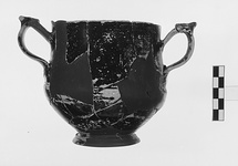 | Description: | Mended from many fragments; five non-joining pieces also belong. Restored in plaster. The clay very soft, with badly worn edges which do not make clean joins. Fragments of base, body, lip and one handle missing. Deep body; two vertical band handles with a moulded ivy leaf on top of each; two incised lines encircling the vase below the handles. Low spreading foot with raised band on outside. Buff clay; black glaze much worn. | |