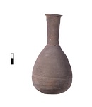 | Description: | Small rough hole in one side. Flattened bottom. Small pear-shaped body, to which the long neck tapers slightly. Flat, turned-back rim. Surface left rough from the wheel. Light red clay. Dull gray paint worn in patches on the neck. | |