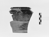 | Description: | Complete circle of base and part of side and lip preserved. Low ring base. Sides nearly vertical but inclining slightly inward. Trace of handle attachment. Upper half of exterior decorated with panels of concentric rectangles in clay colored paint; above two grooves; below, one groove. Pinkish clay; black glaze, good on interior; fired reddish brown on part of exterior. | |