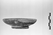 | Description: | Intact. Ring foot, narrow resting surface. Incurved rim. Stacking ring on floor. Glazed all over. Black to brown glaze, much worn and peeling. Light orange clay. | |