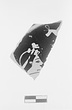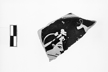 | Description: | Head of youth, right, in corner of fragment; back of neck and tip of chin are missing; hair rendered with plain outline like skull cap, garlanded, (simple band round back of head, summary representation of flowers(?) over brow). In the field above, right, part of some object with bow of string tied to it (wine skin?). Outlines of back of head and surrounding black glaze background are distinct, with narrow reserved band between, and are of the same rather coarse variety of relief lines as are used for the interior drawing. Details inconvenient to reserve, (garland, and bowknot on object in the field) are painted over black glaze with thick paint imitating the clay in color and texture. Frontal eye in profile face curious in company with these developed labor-saving devices. Attic clay, good black glaze. Manner of the Euergides Painter. | |