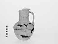 | Description: | About half the lip and fragments of the body and base missing. Cylindrical neck with outturned lip, similar to P 2873. Single vertical handle. Low ring base. Reddish brown micaceous clay. Unglazed. | |